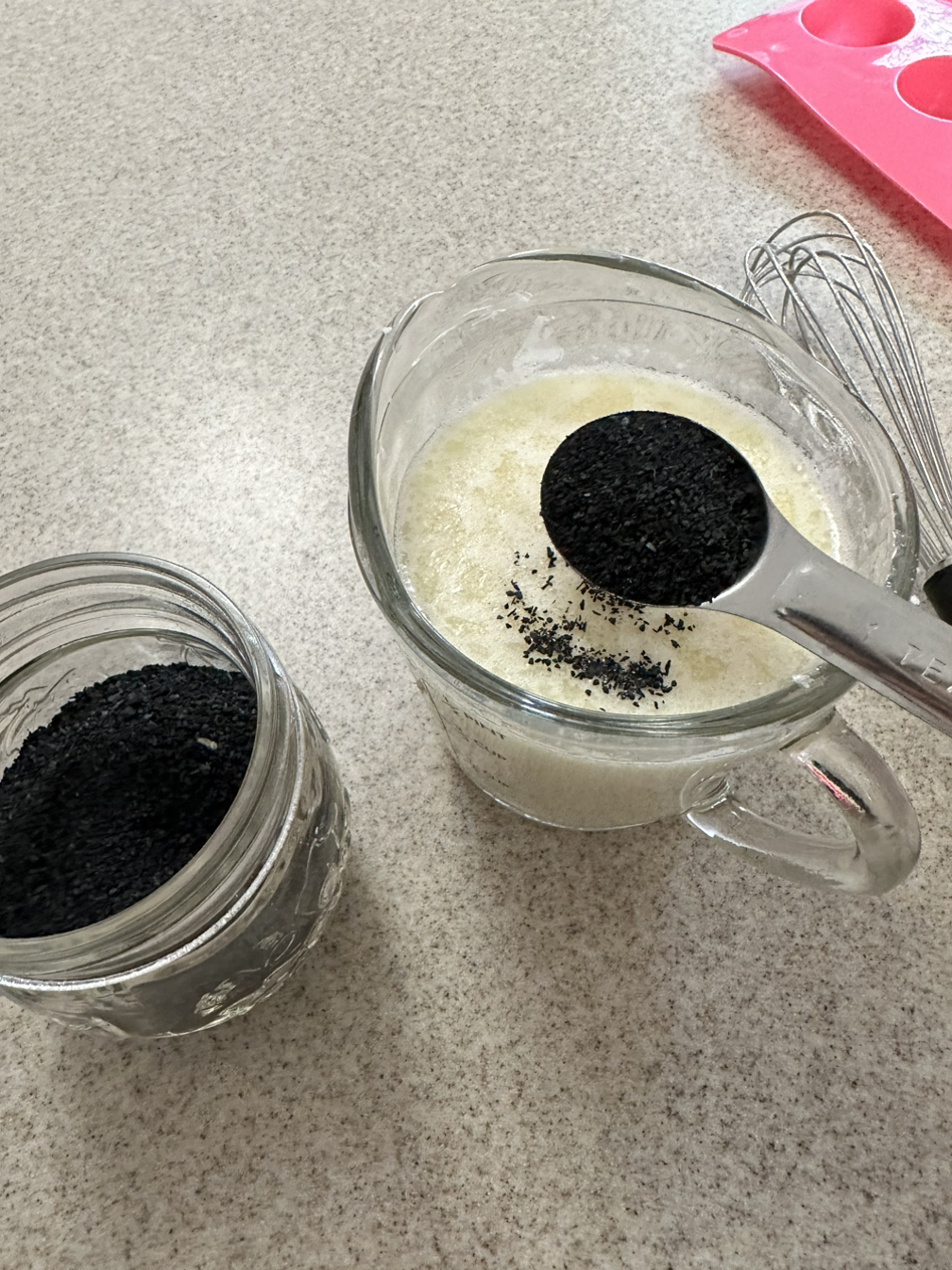 2. 활성 숯가루와 에센셜 오일을 용기에 첨가하고 거품기로 잘 섞이도록 저어준다.