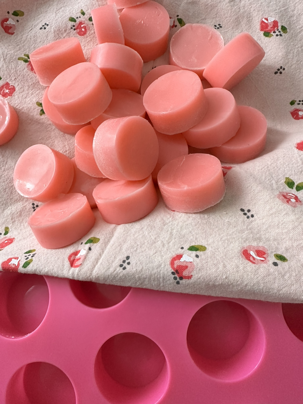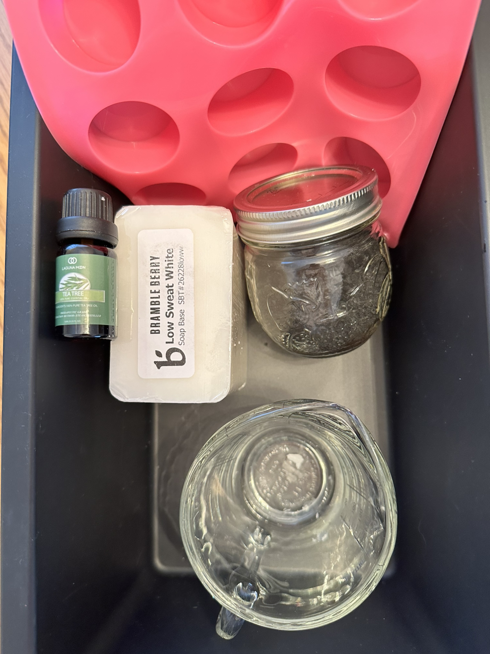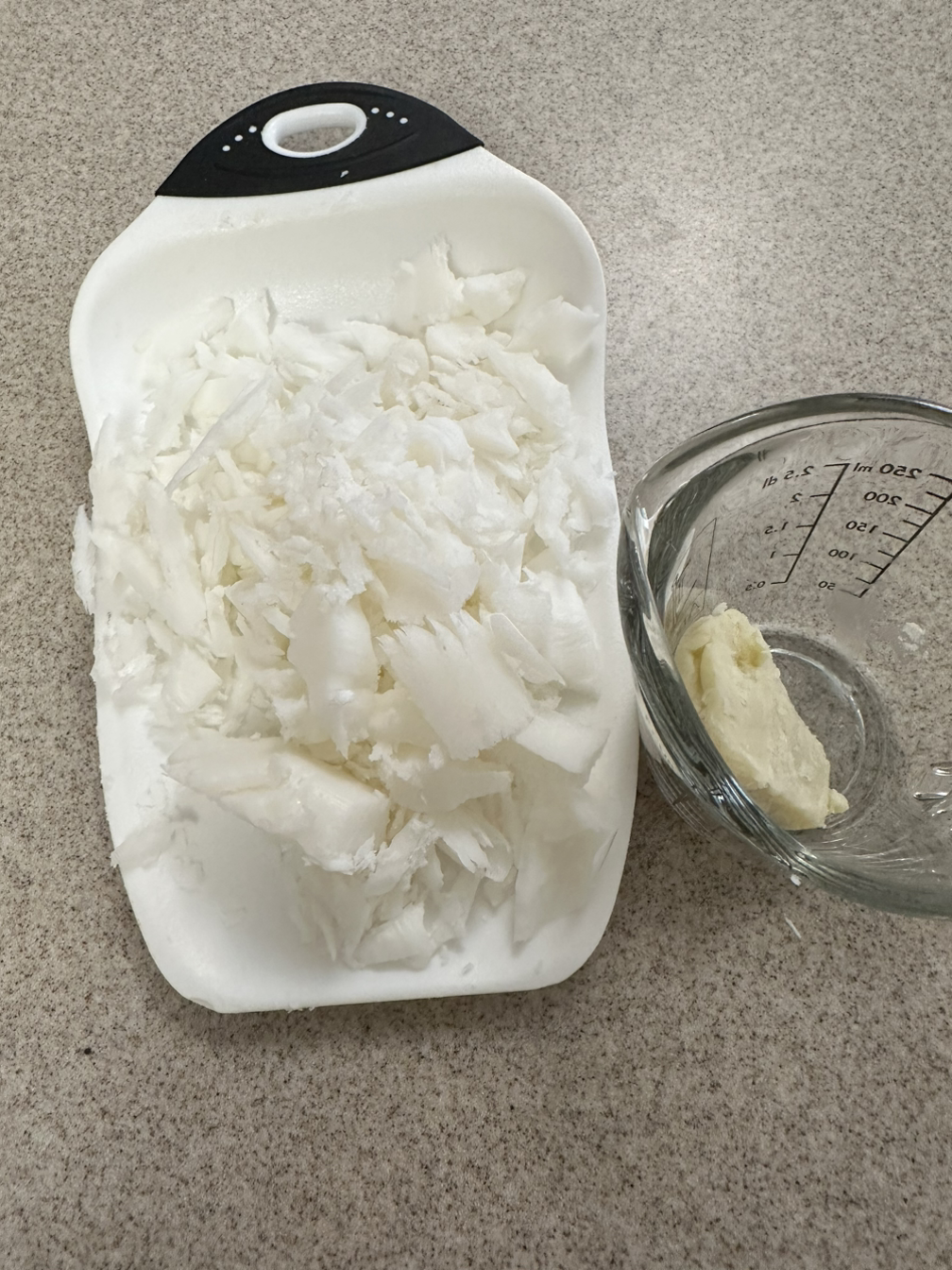 1. 솝 베이스와 시아버터를 전자레인지용 유리그릇에 넣어 녹인다. 30초씩 돌려가며 고형 비누가 다 녹을 때까지 돌린다.