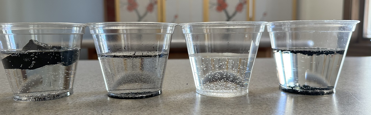 활성 숯을 만들어 요오드 용액을 넣고 실험을 해 보았다. 왼쪽에서 첫 번째는 숯 덩어리를 넣고 두 번째는 성긴 활성 숯가루, 세 번째는 맹물, 네 번째가 고은 활성 숯가루를 넣었다. 네 번째 고은 활성 숯가루를 넣은 물이 가장 맑다.