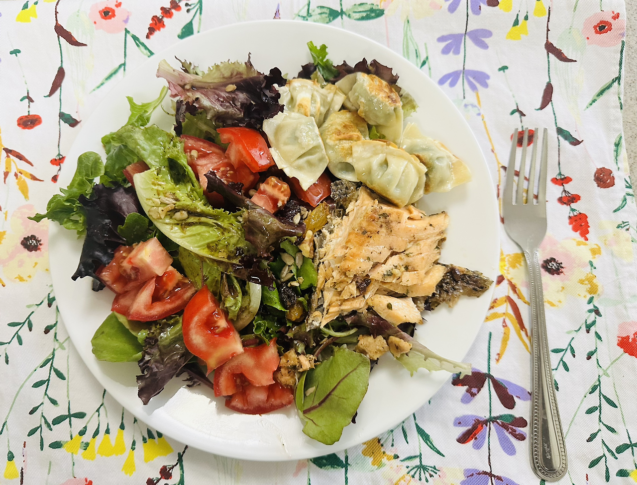 상추를 접시의 바닥에 덮고 토마토나 오이 등을 썰어 넣고 넛 (호박씨, 호두등)이나 건포도를 더한 다음 발사믹 식초를 뿌린다. 그 위에 연어를 한 토막 얹은 다음 조그만 튀김 만두를 올렸다. 올리브 오일과 발사믹 식초가 어우러져 모든 식재료의 풍미를 더한다. 남편이 딜리셔스를 연발한다.