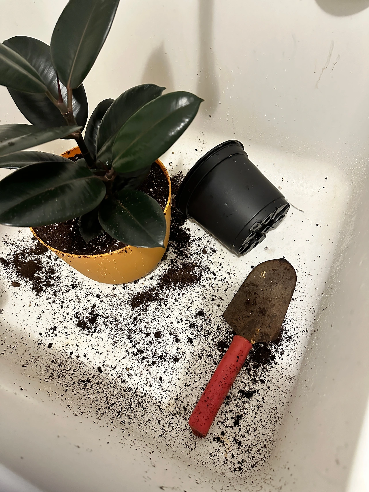 1. 고무나무가 든 화분을 옆으로 기울여 부드럽게 빼낸다.