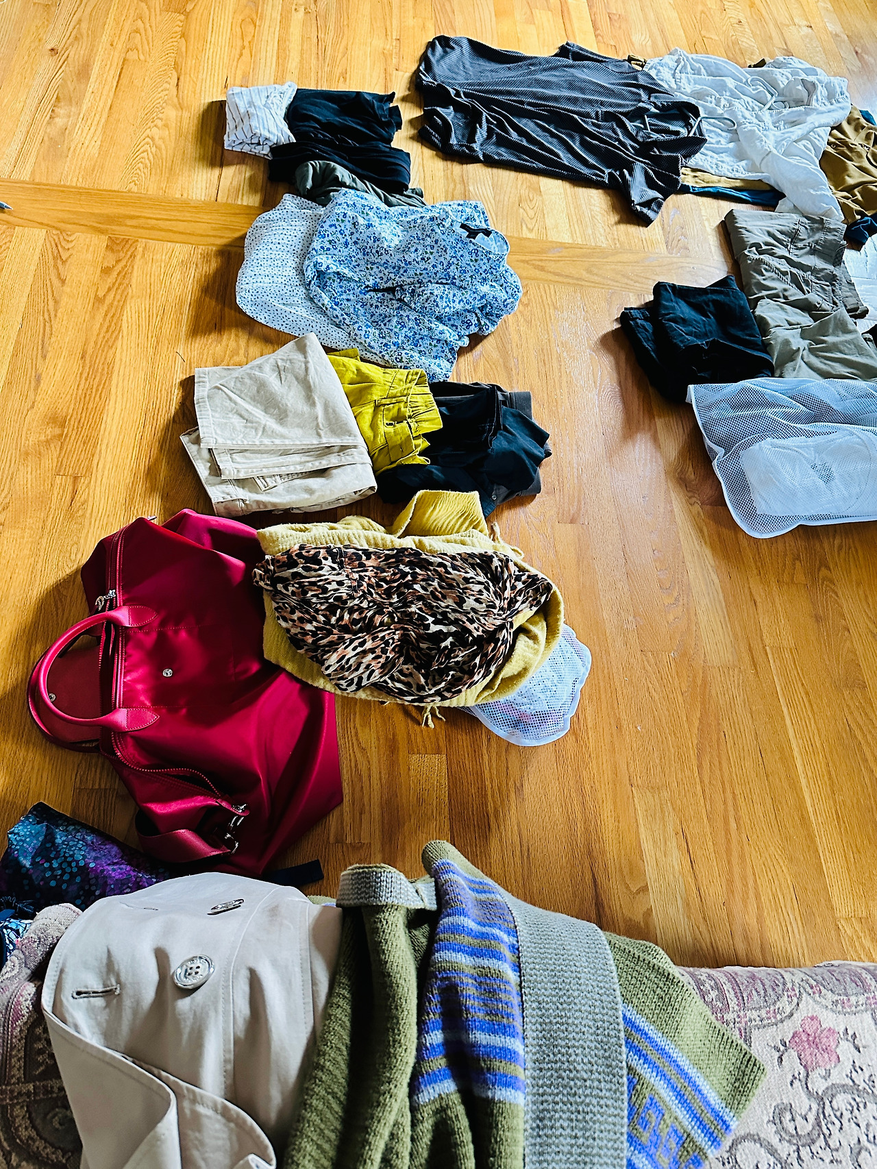 바닥에 펼쳐 놓아 남편의 옷 색과도 맞추어 보고 정리해 놓은 옷을 입어 보고 추가하거나 빼거나 했다. 옷들을 모아 넉넉한 크기의 숄더백에 넣어보니 쏙 들어간다.