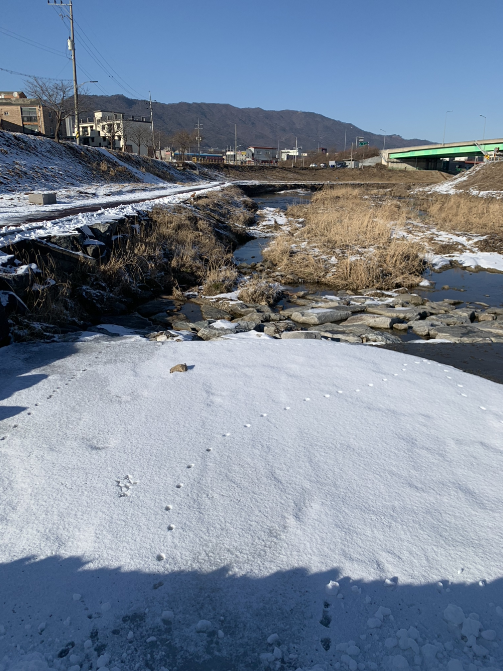 오래간만에 혼자 걸었다. 좀 걸어야했다. 엊그제 눈이 와서 그런지 길은 하얗고 눈이 부셨다. 밟을 때마다 뽀드득, 소리도 경쾌하다. 삼십여 분 , 한 시간, 한시간 반, 하천 산책로를 따라 걷고 또 걸었다.