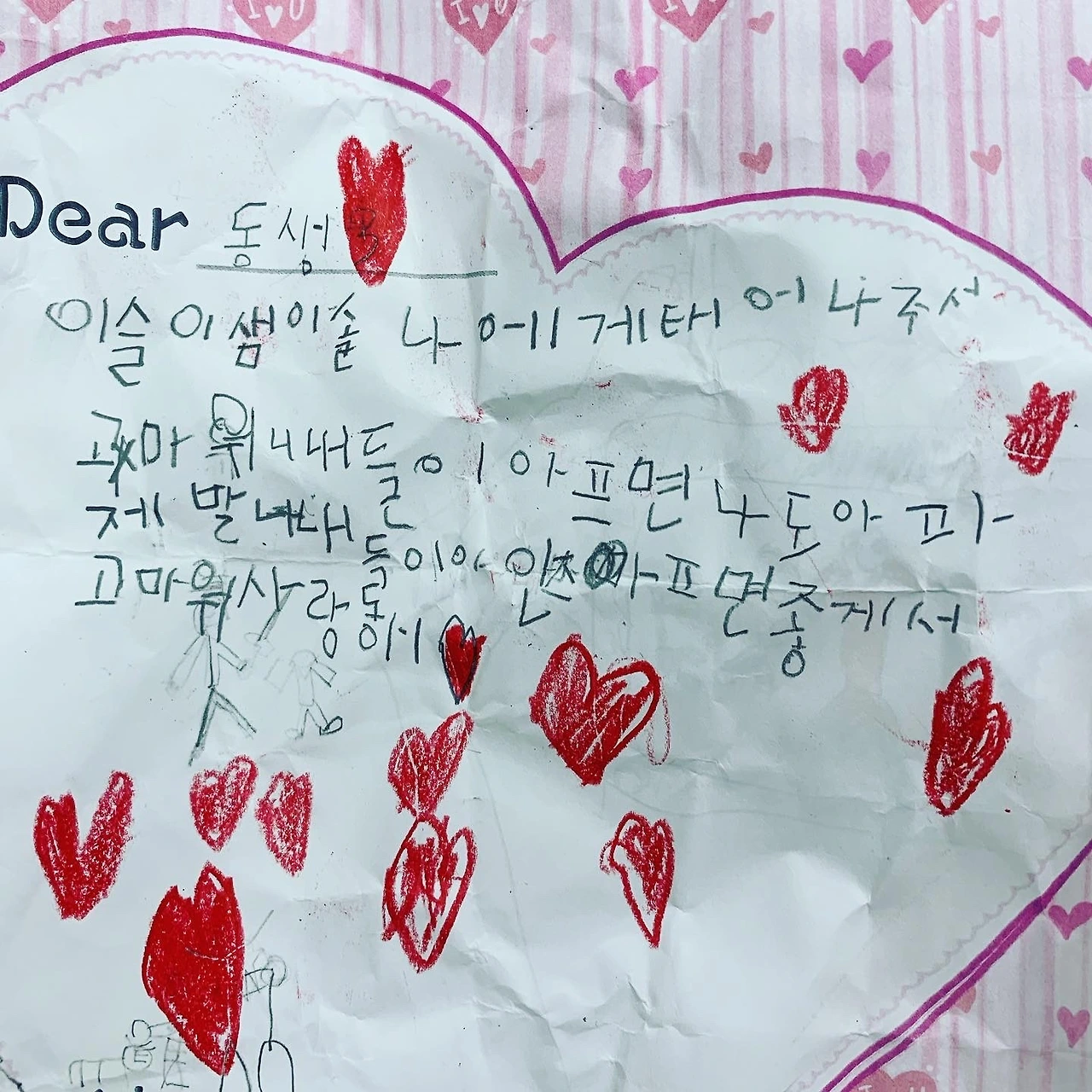 어느 날 첫째가 돌봄을 끝내고 가방을 보는데 꾸깃꾸깃 접힌 종이 한 장 쓰레긴가 싶어 버리려다 펼쳐보니 절대 버려선 안될 소중한 편지 한 장이 있었다