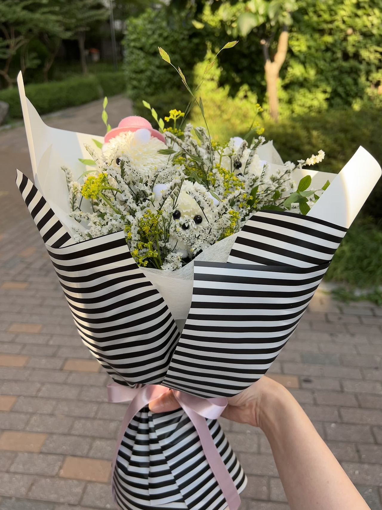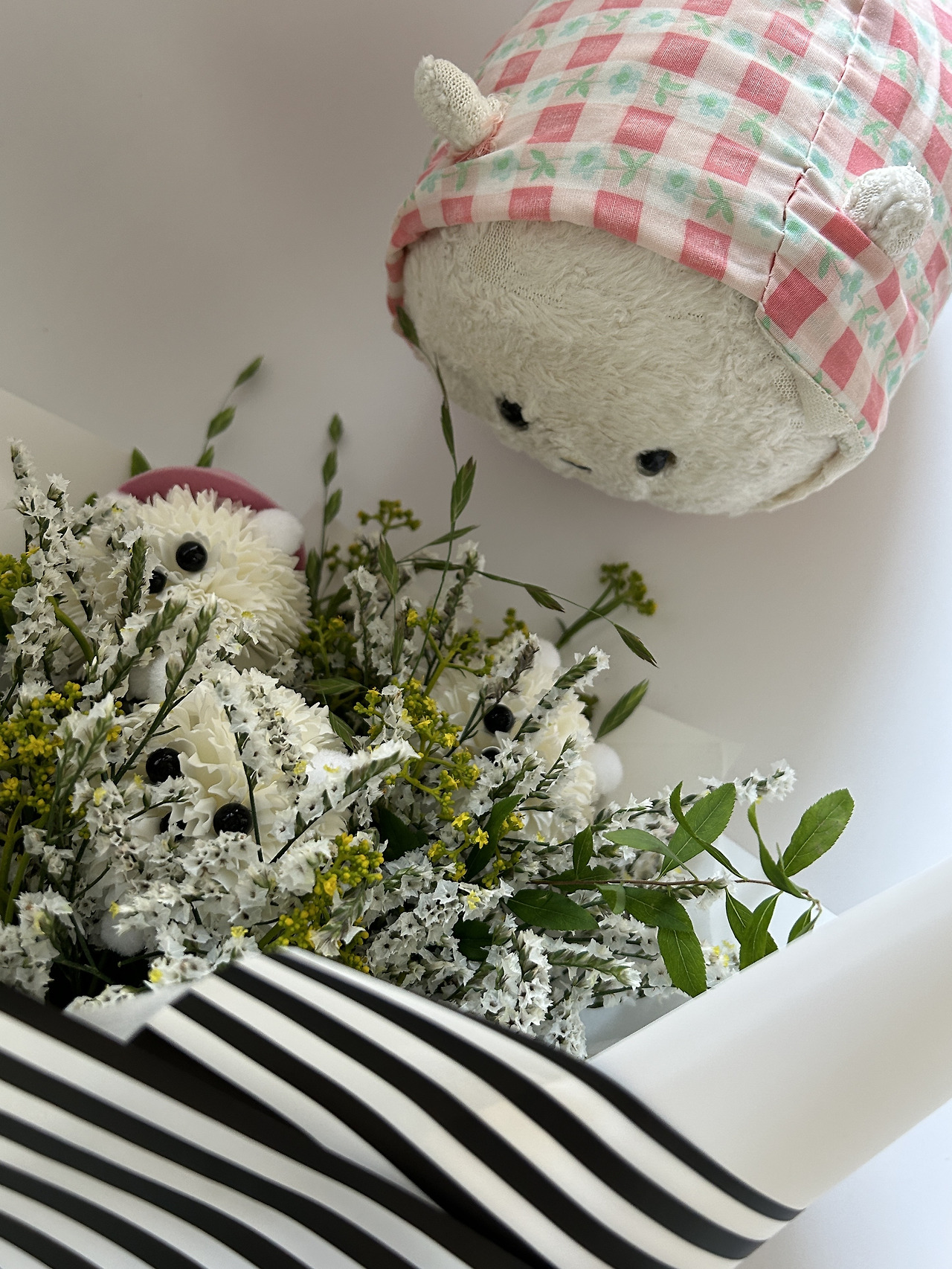 꽃다발 만들기 일곱 번째 수업 이벤트 다발. 새하얀 시네신스, 앙증맞은 꽃잎들이 어여쁜 마타리, 유니폴라, 설유화, 그리고 비누꽃. 두고두고 오래 간직할 수 있는 소재로 만드는 이벤트 꽃다발에는 오래도록 축하의 마음이 담겨있다. 특히 비누꽃으로 나만의 캐릭터를 만들어 선물하면 좋아한단다. 나는 비누꽃으로 32년째 반려인형 복실이를 만들었다. 두고두고 오래 간직할 수 있다 하니, 오래 함께하고 싶은 내 사랑을 담은 것이다. 다만 비누꽃은 물에 닿으면 녹아버린다. 물로부터 지켜내면 사라지지 않는다. 그럼에도 조금씩 산화되어 언젠간 사라질 것이다. 사라지는 것들을 사랑하라. 그것들의 빠른 사라짐을 이해하라. 만드는 내내 동심. 귀여움 뿜뿜 했던 시간이었다만. 사라져 가는 삶을 되새긴다. “모든 것은 곧 사라지는데 왜 집착하는가? 당신은 이미 완전하다. 단지 아직 그걸 모를 뿐! 자신에게 다가오는 가르침에 늘 깨어 있어야 한다.” 불교 신자는 아니지만 현각 스님의 말씀을 남겨 본다.