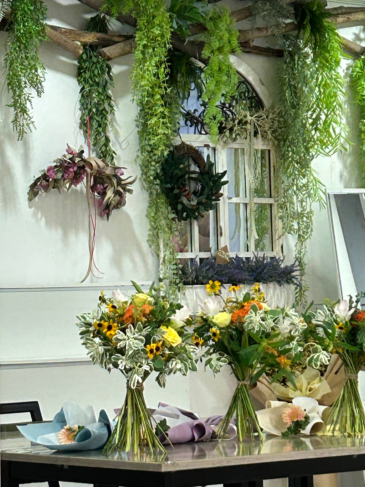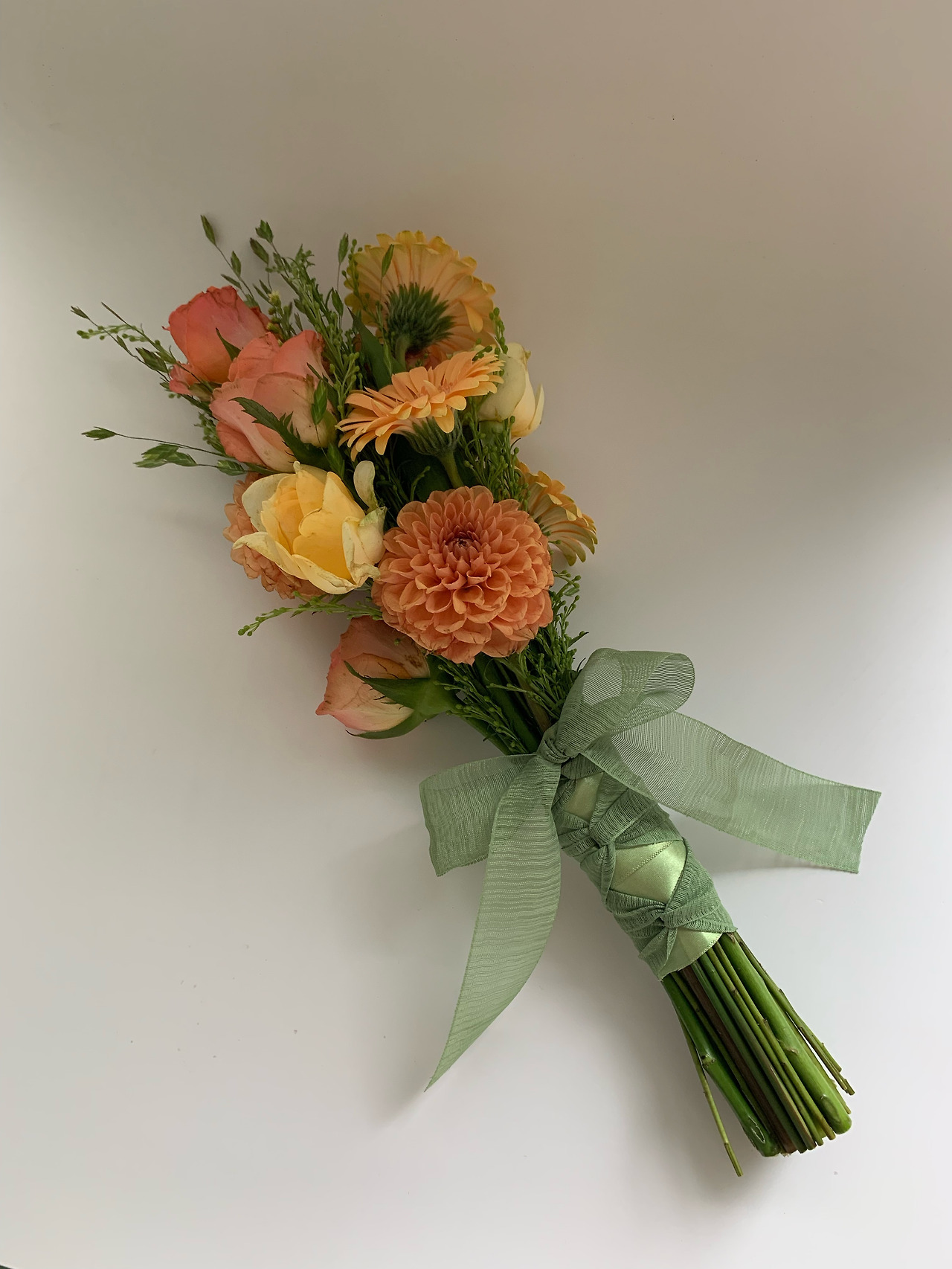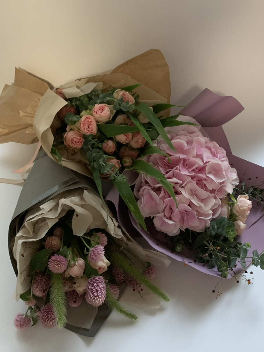 꽃다발 만들기 다섯 번째 수업 미니다발. 이날은 세 가지 꽃다발을 만들었다. 꽃다발 유래는 고대로 거슬러 올라간다. 고대 민족은 신의 축복을 얻는 수단으로 화관이나 꽃다발을 몸에 걸쳤다. 고대인은 신이 사는 곳을 화원이라고 생각했다. 부케는 꽃다발이라는 프랑스말에서 유래했다. 풍요・다산・번영을 나타내는 벼 이삭 등의 곡물로 나쁜 귀신이나 질병으로부터 신부를 보호했다. 16세기 이후 꽃의 치료적 의미와 종교적 의미가 확산되면서 벼 이삭 대신 들판에 피는 꽃으로 신부를 장식하기 시작했다. 우리나라에는 1950년대 이후 서양 결혼식이 도입되면서 부케를 만들어 신부를 장식했다. 수천 년 역사를 거슬러 21세기 꽃다발이 되기까지. 억겁의 기원이 담겨있다. 꽃으로 지키고자 했던, 고대인의 간절한 축복을 되새겨 볼 일이다. 받자. 축, 복을 다발로!
