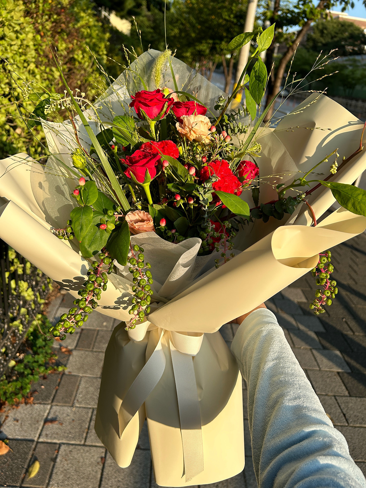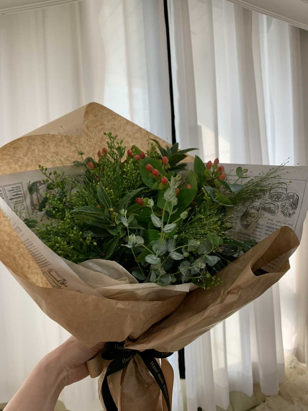 꽃다발 만들기 열 번째. 가장 풍성해 보이는 꽃다발을 배운 날이다. 이름은 프론트 페이싱, 일명 프리젠테이션 꽃다발이다. 꽃들 얼굴이 정면에서 잘 보이게 높낮이를 줘 배치하는 다발이다. 각자 역할을 잘할 수 있도록! 꽃들 하나하나가 잘 살 수 있도록 구성하는 게 관건이다. 풍성함의 비결은 각자의 자리에서 자신의 역할을 잘 해낼 때라는 생각. 순간순간의 성실한 최선이 풍성함을 만든다. 열 번의 꽃다발 포장 수업이 끝났다. 지난 2달. 40시간 동안 밀도 있게 풍성해졌던 시간이었다.