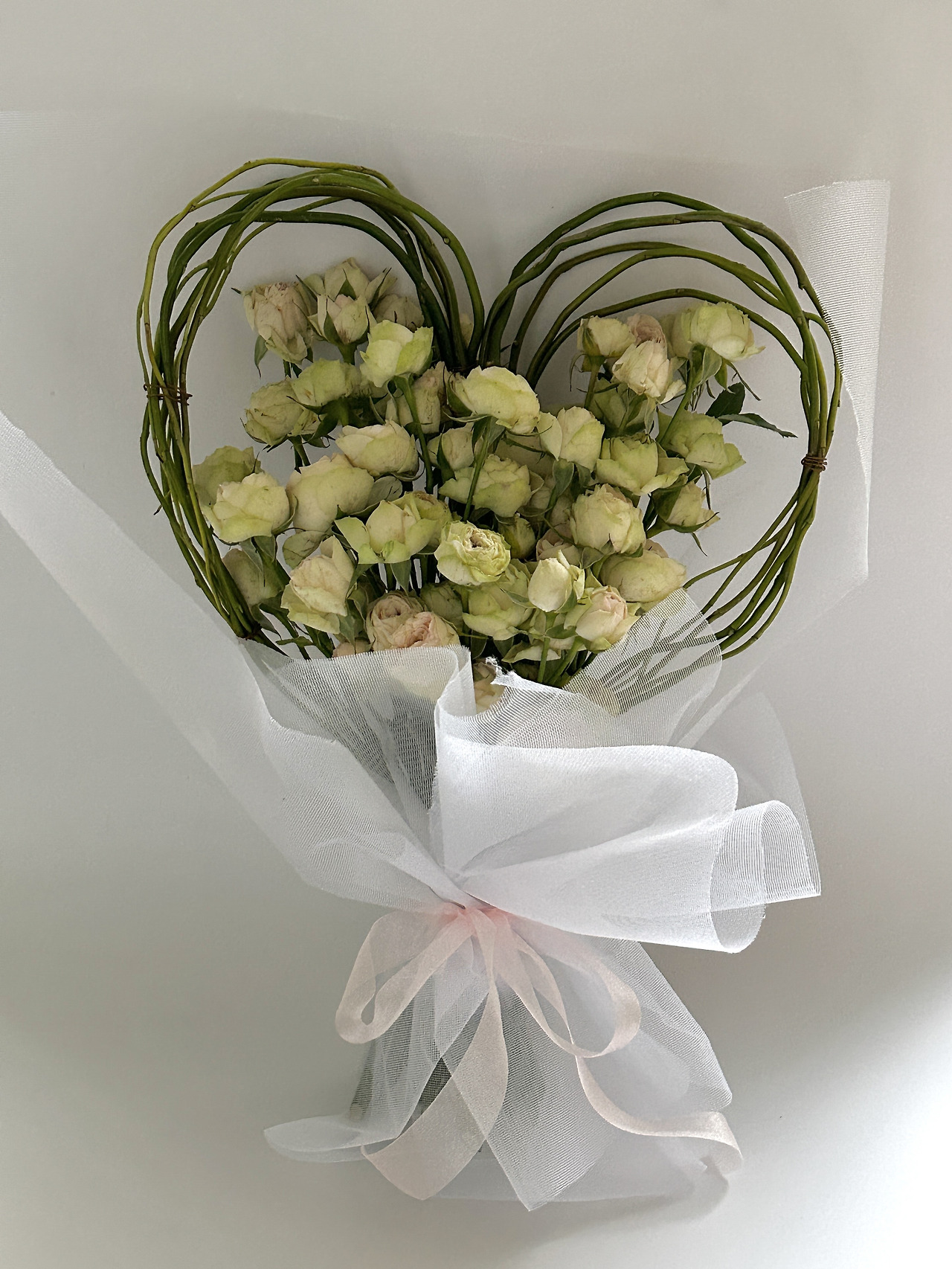 꽃다발 만들기 여섯 번째 수업. 하트 모양으로 만드는 하트 프레임 꽃다발이다. 곱슬 버들로 하트모양 구조물을 만들고 그 안에 미니장미를 하트 모양으로 채워 넣는다. 하트 구조물 왼쪽 위부터 중앙을 거쳐 우측 상단까지 미니 장미를 차례로 채워나간다. 확실히 나는 하나를 알려주면 둘을 아는 사람은 아닌 거 같다는 좌절과 체념. 그래도 배우기로 마음먹었다면 연습은 접어둘 수 없는 단어다. 선생님이 수업 내내 연습을 강조하셨다. 배우는 시간은 좌절의 연속인데, 스스로에 대한 꾸준한 실망과 낙담을 견딜 수 있는 유일한 방법이 연습이다. 실망하고 연습하고 약간 회복하고, 또다시 실망하고 습관처럼 연습하고 조금 더 회복하는 시간을 무한히 반복하다 보면, 어느 순간 미세하게 성장해 있는 자신을 발견할 수 있을까. 나를 지켜내는 연습. 스스로에게 사랑을 주는 연습. 타인에게 흔들리지 않는 연습. 매일 연습 중이다.