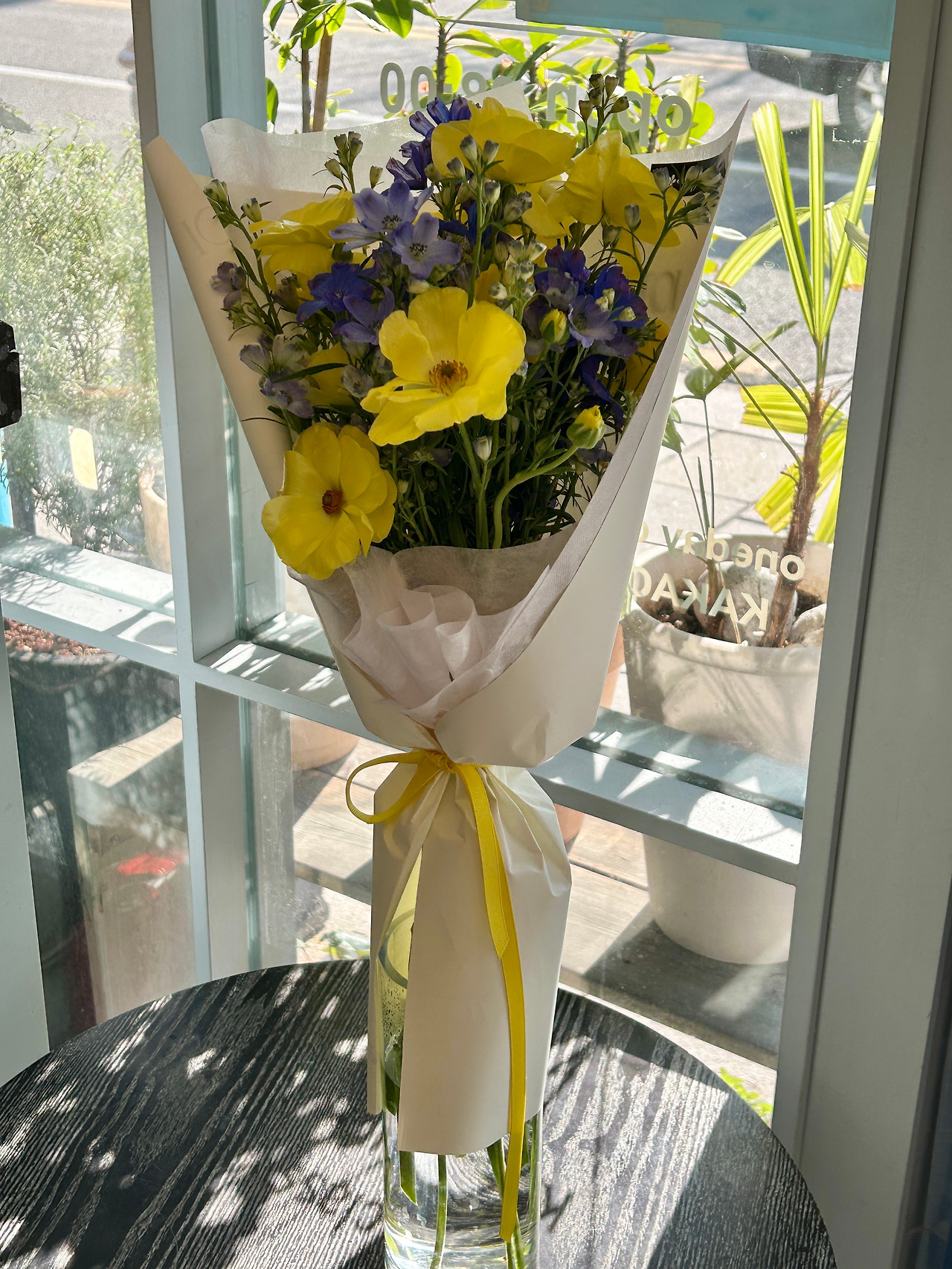 꽃다발을 만들다 무의식적으로 쨍한 색의 봄꽃들만 골랐다. 선명한 색은, 선명한 마음을 부르는 걸까. 노란 나비가 날아 앉은 듯한 샛노란 버터플라이 라넌. 푸르른 미니 델피늄. 그 대비 속에 선명한 미래를 담는다.