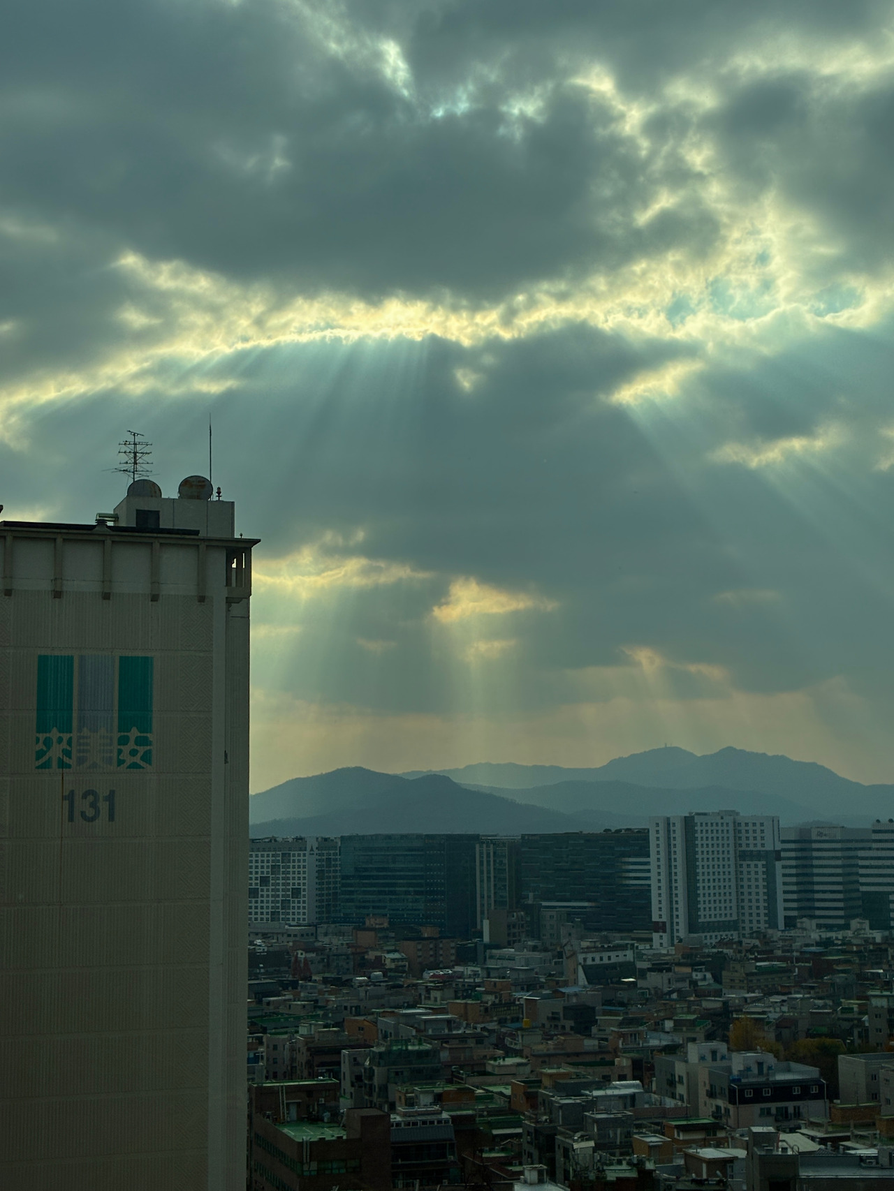 어느덧 무던히 받아들이게 되었다. 벗의 소천을. 오늘은 그녀가 하늘로 떠난 지 4년이 되는 날이다. 일상을 보내다 문득 하늘을 올려다보는데, 구름 사이로 빛이 스며 나왔다.