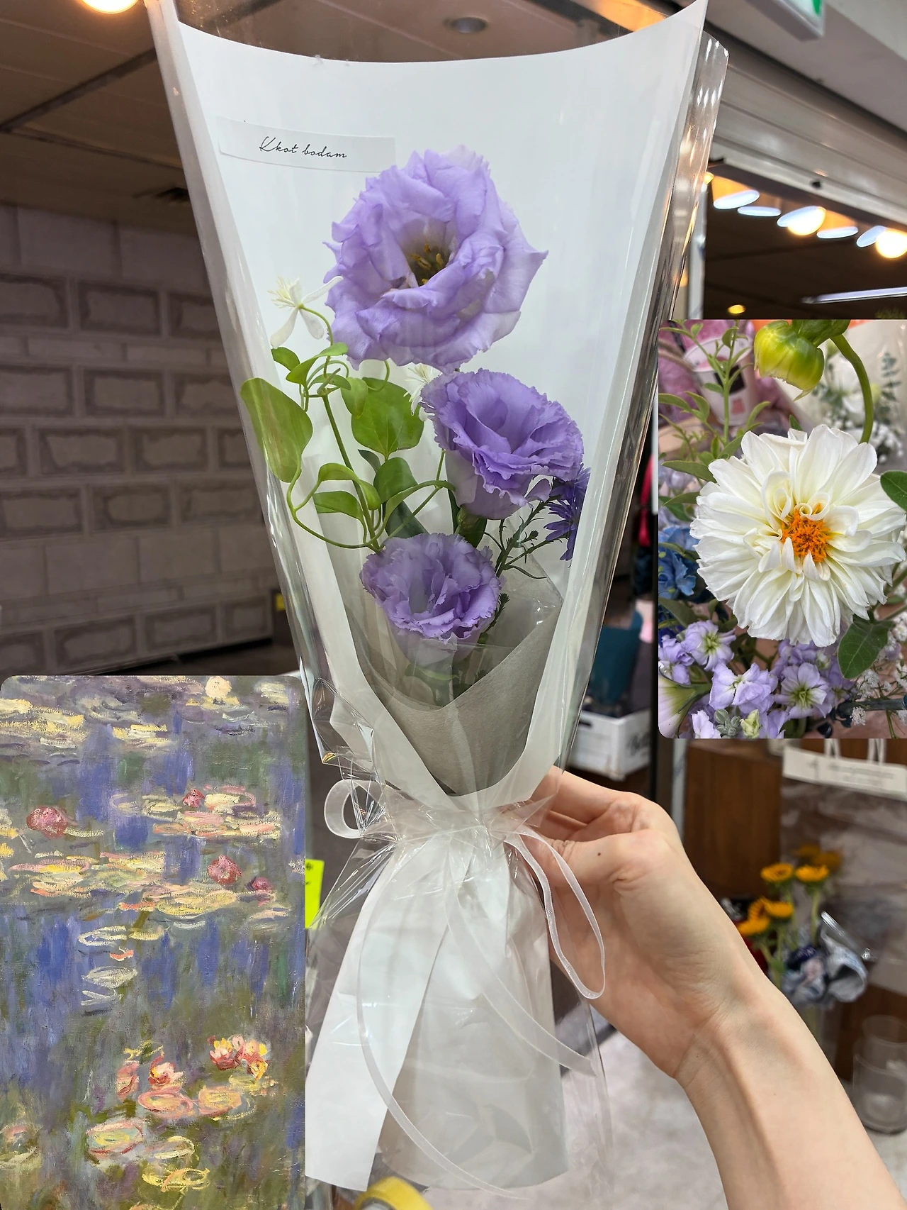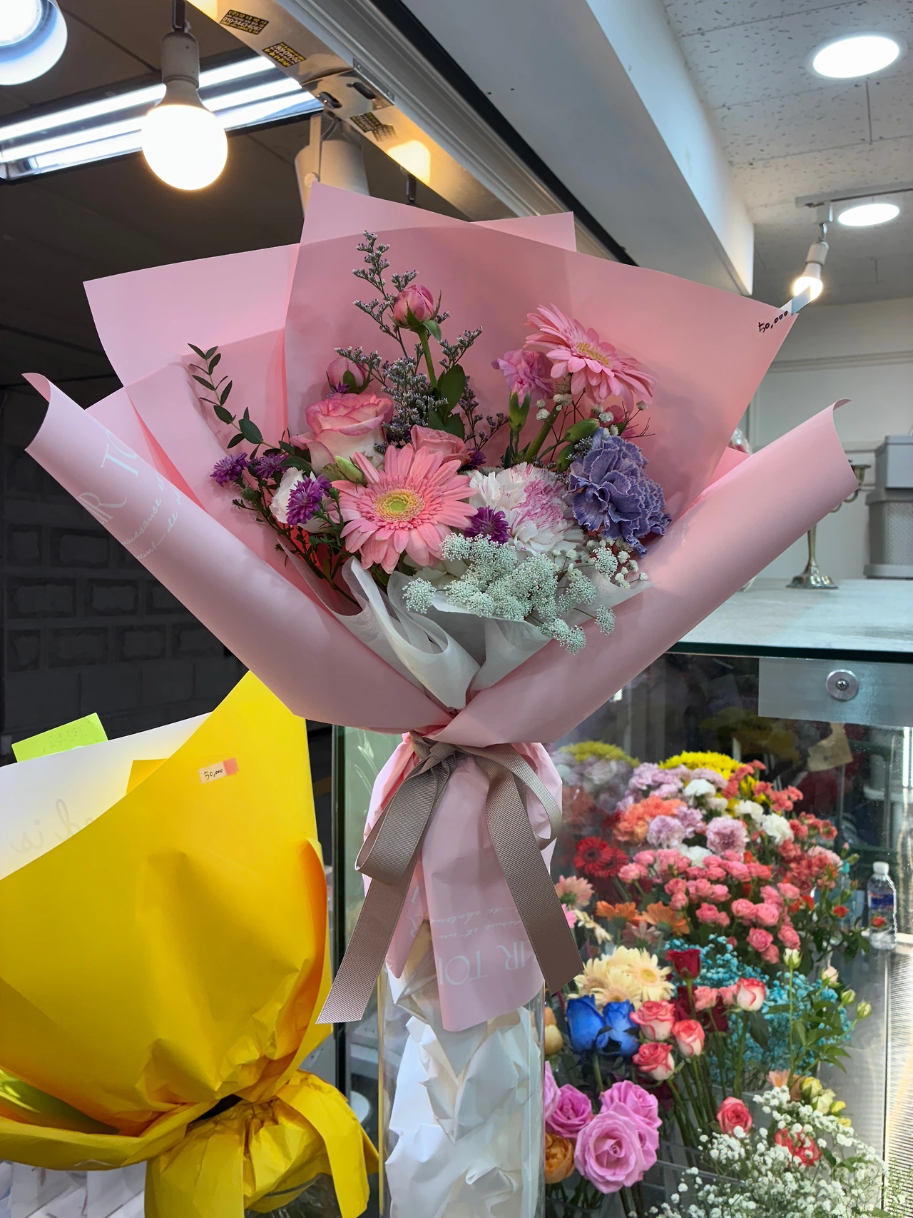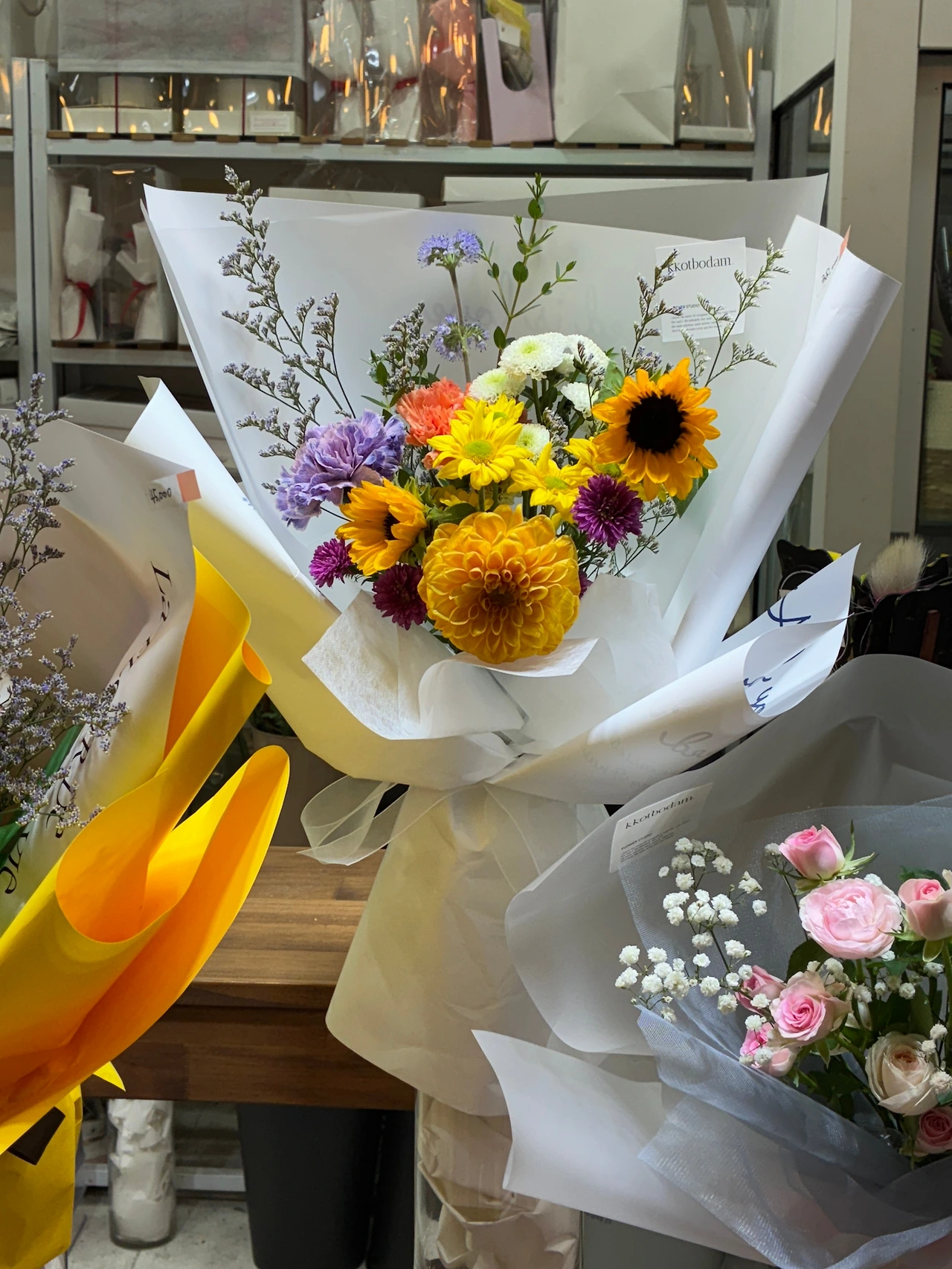 사장이 오면 내가 만든 꽃다발마다 피드백을 주면서 중간중간 손님을 응대했는데 친절한 듯 무심한 듯 능숙한 듯 판매하는 사장을 보고 나도 배운다. 대부분 만 원대 꽃다발을 사러 오는 고객이고 금방금방 소진된다. 플라워카페에서 일할 때는 대부분 예약제라 주로 사장이 만들기 때문에 꽃다발을 잡을 기회가 많지 않았다. 반면 유동인구가 많은 지하철 꽃집은 수요가 많은 곳이라 틈만 나면 그야먈로 미친 듯이 꽃다발만 만들다 퇴근할 정도로 꽃다발을 많이 잡아볼 수 있는 학습의 장이다.