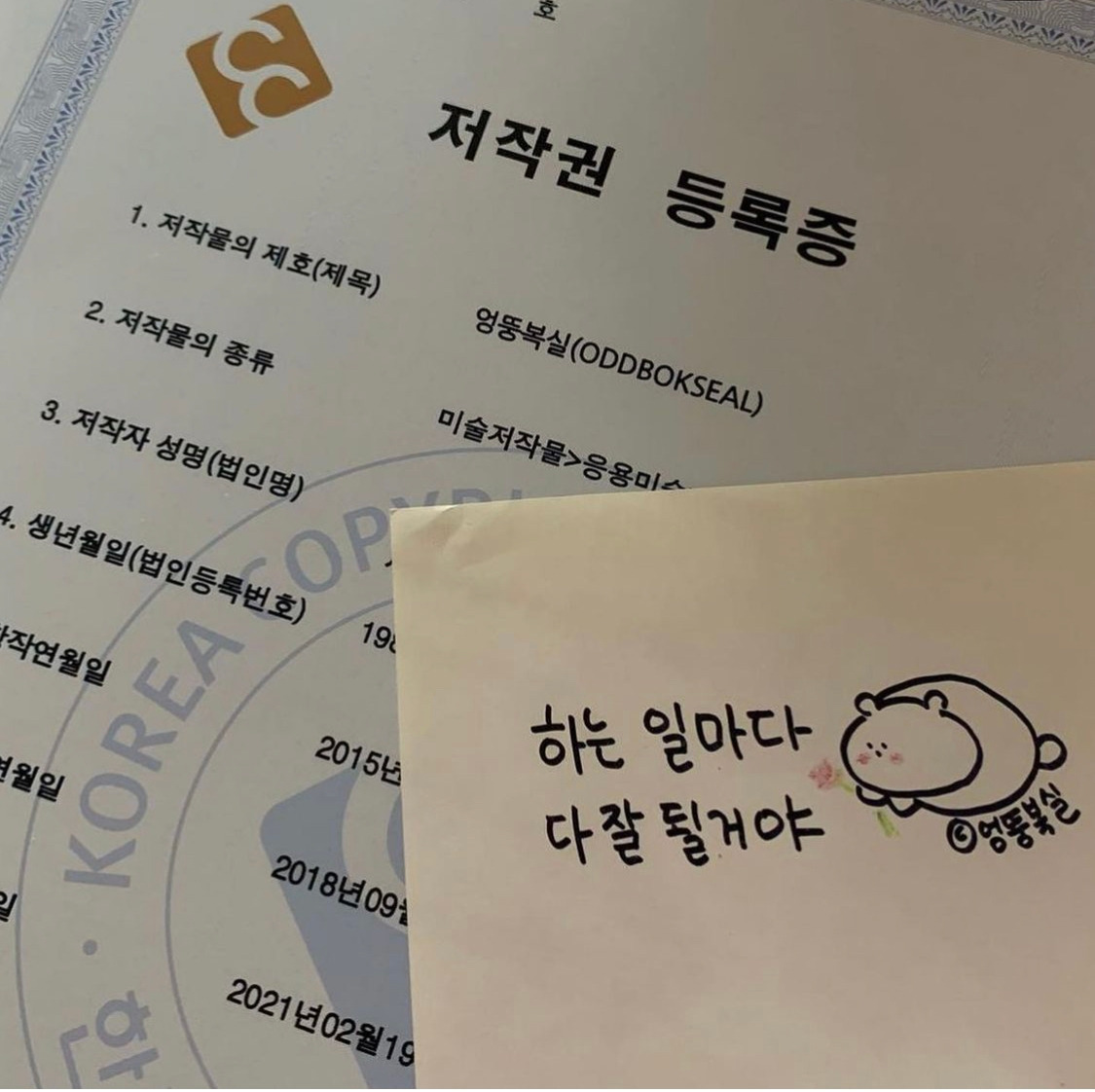 셀프로 한국저작권위원회에 등록한 엉뚱복실 저작권 등록증