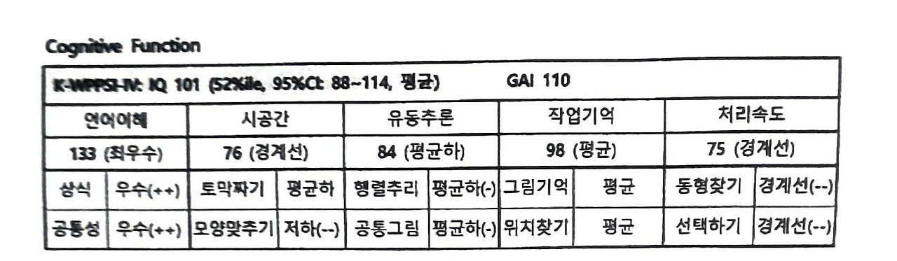 우리 아이는 앞서 두 곳에서 검사를 받았을 때처럼 병원 검사에서도 언어는 우수로 나오고, 나머지 부분들은 평균 혹은 경계선이나 평균이하로 나왔다.