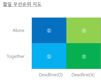 이런 아쉬움을 담아 실무자 관점에서 할 일 우선순위 지도를 제 나름의 기준으로 그려봤습니다. 수시로 갑작스러운 업무 지시를 받고, 여러 부서/사람과 관련된 스케줄을 맞춰 나가야 하는 PM, 중간 관리자 역할을 하는 실무자분들이 좀 더 효율적으로 업무를 처리하고, 성과를 거두는 업무 영역에 집중할 수 있었으면 합니다.