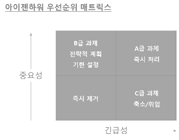 시간관리 교육에서 자주 소개되는 아이젠하워 우선순위 매트릭스입니다. 업무의 중요성과 긴급성을 기준으로 업무를 구분하고 중요하지 않고 시급하지 않은 일은 제거하거나 위임하라는 것인데요.