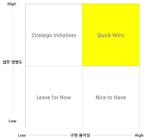 1. Quick Wins : 상대적으로 실행이 용이하고, 그에 따른 효과도 상당함