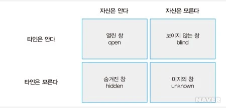 조셉 러프트(Joseph Luft)와 해리 잉햄(Harry Ingham)이라는 두 심리학자의 논문에서 소개된 이 모델은 자기 공개, 상호 피드백이 핵심이다.