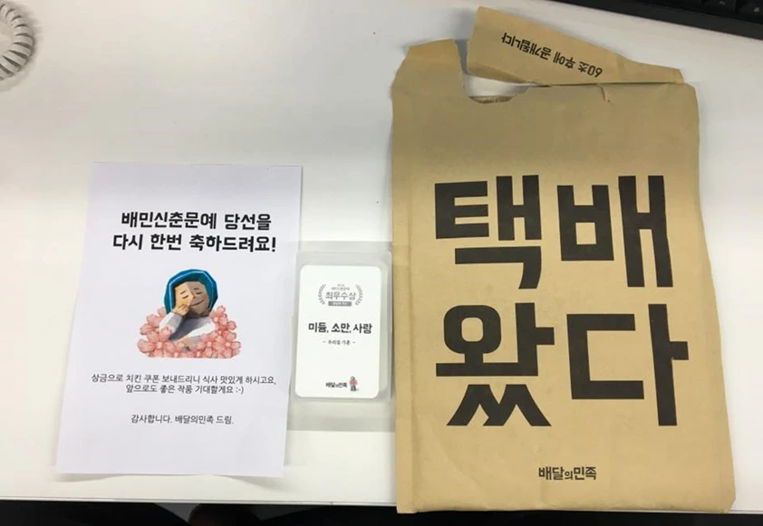 “안녕하세요. 제출해주신 작품이 배달의 민족 신춘문예 대상 후보에 선정되었습니다. 축하드립니다!”
