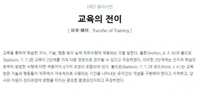 교육학에서는 이를 ‘교육의 전이'라고 한다. 현장의 성과창출을 지원하는 것이 주요한 성과 목표 중 하나인 기업교육 분야에서는 교육의 전이도를 높이기 위해 액션러닝(Action Learning), PBL(Problem Based Learning) 등 다양한 교육 방법을 활용한다. 교육 종료 후에는 실제로 해당 교육이 현업에 효과적으로 적용됐는지, 적용 과정에서 어려움은 없는지 교육 전이 효과성을 분석하는 프로젝트를 수행하기도 한다.