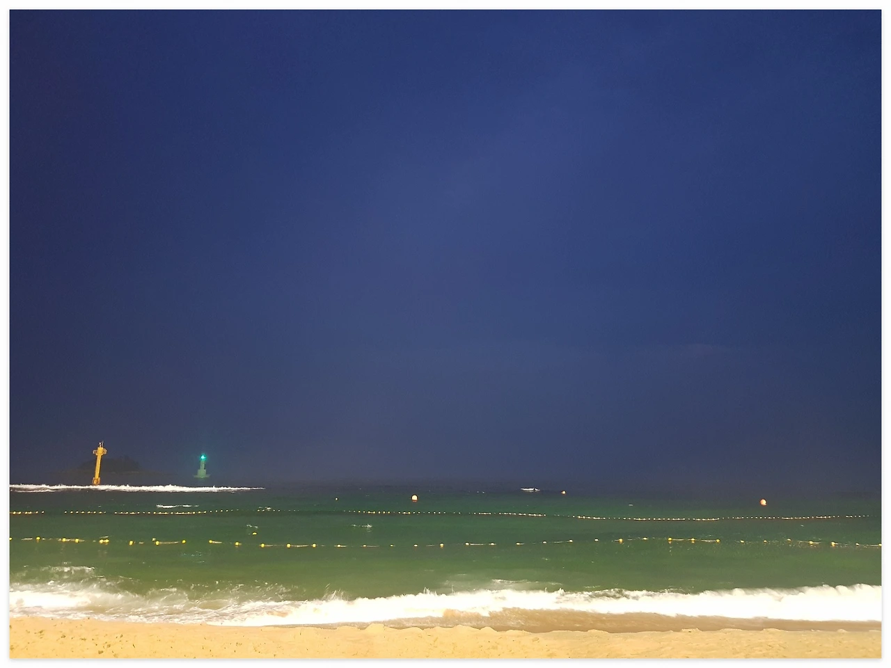 저녁 식사를 마치고 다시 숙소로 돌아온 우리 셋은 퍼졌다. 평소 1시간 30분에서 2시간을 꼭 자야 하는 아이는 오늘 차에서만 잠깐 쪽잠을 잤다. 아내와 나는 피곤한 몸을 움직여 이불을 깔고 잠자리를 준비했다. 우리 집에는 티브이가 없는데, 그래서 아이는 티브이가 있는 곳에서도 깊게 몰입하지는 않는다. 적당한 프로그램을 적당한 볼륨으로 틀어 놓으니 아이는 뒹굴거리다가 화면을 보다가 엄마를 찾다가 이내 잠이 들었다. 내가 스르르 잠에 취할 무렵 아내가 산책을 다녀오겠다는 말을 들었다. 그리고 나는 잠들었다. 다음날 아침 내 스마트폰에는 예쁜 바다 야경 사진이 도착해 있었다.
