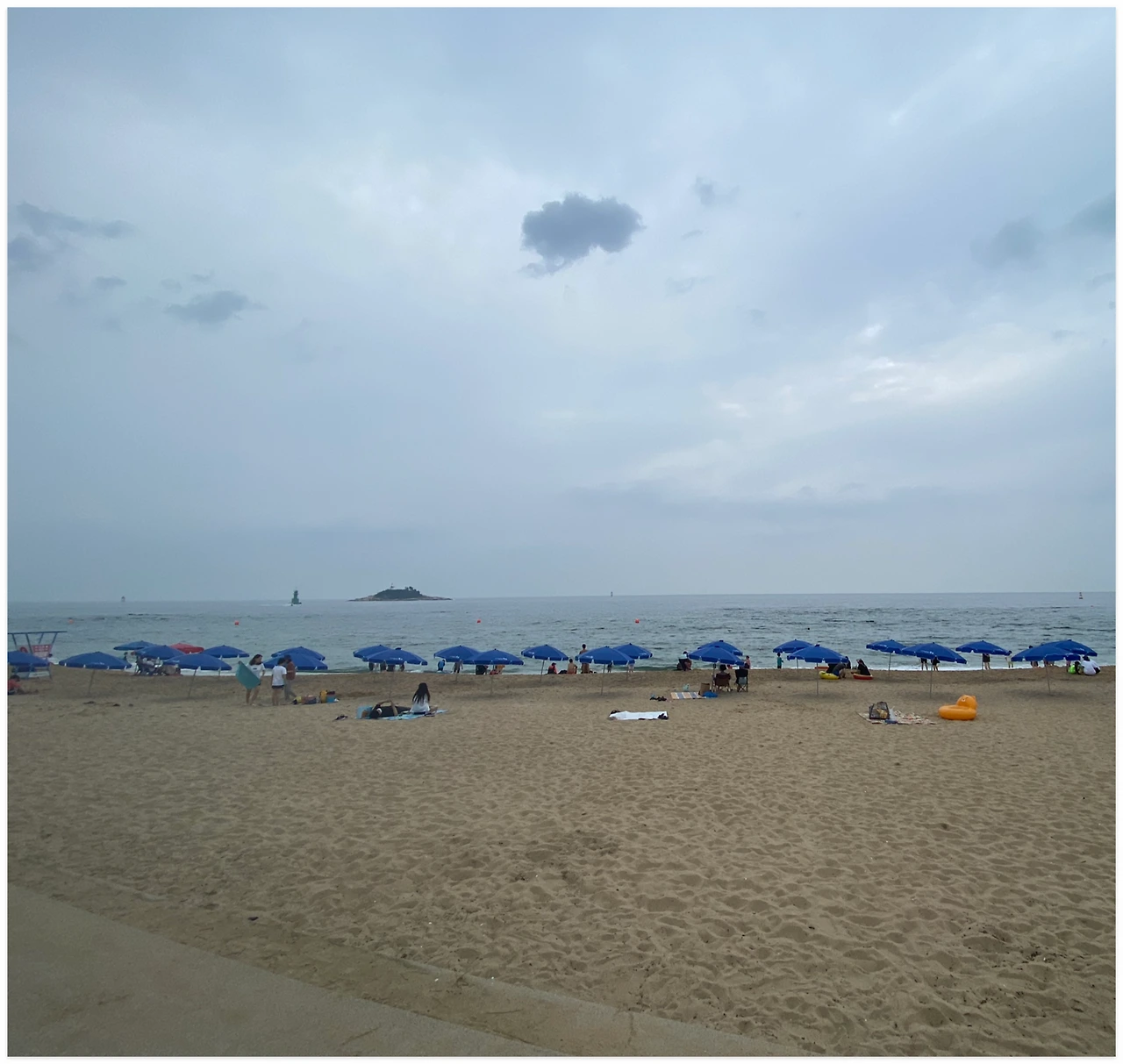 수평선을 중심으로 바다와 구름은 가로로 접은 데칼코마니처럼 푸르스름한 회색빛을 띄고 있었다. 다만 바다는 하늘보다 더욱 역동적으로 파도와 물결을 만들어 내고 있었다. 선선한 바람의 선율과 함께 우리 주변을 지나가는 관광객의 소음은 풍성한 파도소리와 어울려 휴가의 여유와 분주함을 동시에 들려주고 있었다. 여유로움과 분주함? 형용모순적이지만 어쩌랴. 그런 게 여행이고 그런 게 세상인걸. 모래사장 옆을 지나는 보도블록은 당연하게도 모래로 뒤덮여 있었고 그 위를 지나는 유모차의 네 바퀴는 ‘자르르르’하는 소리를 내었다. 아이의 생각을 읽을 수야 없겠지만 분명 엄청난 풍경과 수많은 사람의 생경함에 호기심과 당황함을 동시에 가졌으리라. 이 풍경을 보여주는 것 자체로 나와 아내는 보람을 느꼈다.