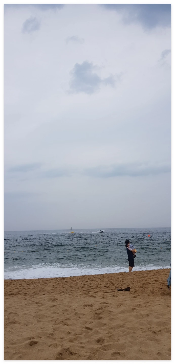 우리는 얼리체크인을 하고 배정된 숙소로 갔다. 6층에 위치한 작은 원룸 형태의 방으로 아쉽게도 바다가 보이는 풍경은 아니었지만 깔끔했다. 간단히 휴식을 취하고 아이에게 간식도 준 후에 우리는 돗자리와 모래놀이 장난감 등을 챙겨 밖으로 다시 나왔다. 아이의 발을 파도에 담가주고 싶던 나는 모래사장에 도착하여 돗자리를 펴자마자 아이와 함께 파도가 밀려오는 해변으로 다가갔다. 아이는 물이 무서웠는지 선뜻 다가서지 못했다. 나는 파도가 떠나간 틈을 타 아이와 두세 걸음 정도 더 물가로 나왔다. 그러자 곧 파도가 다시 밀려왔고 처음 바닷물을 느낀 아이는 화들짝 놀라며 울음을 터뜨렸다. 나 역시도 생각보다 차가운 온도에 깜짝 놀랐다. 발이 젖은 아이는 울상을 지으며 나를 향해 두 팔을 뻗었고 나는 아이를 안았다. 혹독한 신고식을 치른 탓일까? 아이는 다시는 바다에 발을 담그려 하지 않았다. 어쩔 수 없이 다시 돗자리로 돌아왔다. 바다에서 멀어지자 아이는 흐느낌을 멈췄고 모래에 호기심을 보였다.