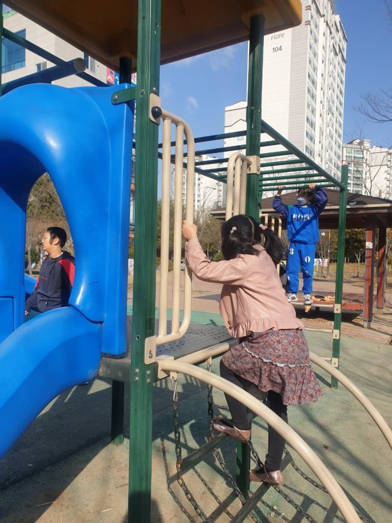 주변에 하나 둘, 하교한 초등학생, 하원하는 유치원생들이 부모와 놀이터에 몰려든다. 몽실이는 더 신났다. 날씨도 제법 포근하고, 바람결도 상쾌하다. 나도 근처 정자에 몽실이 책가방을 내려두고 좀 쉬는 그 시간이 좋았다.