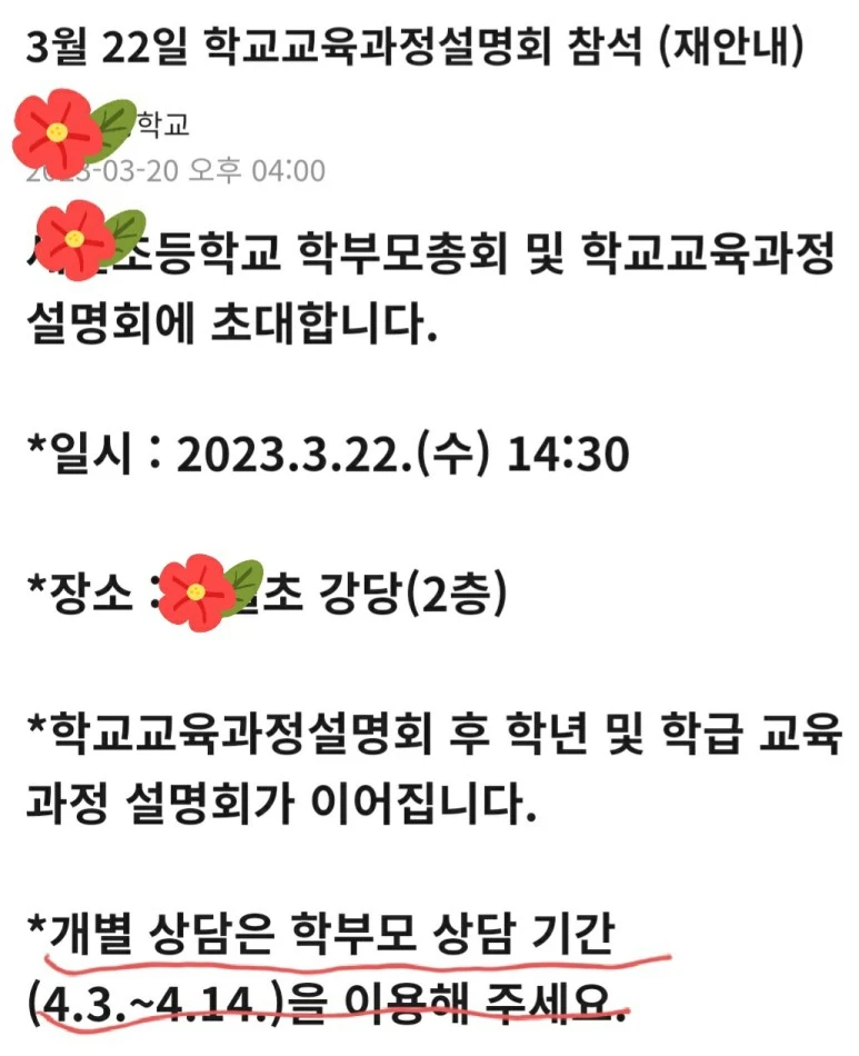 "오시지 못하시는 분들 많고! 안 오신 분들께는 학교에서 설명서 안내장 만들어서 가정에 다 발송하니 그거 참고하면 돼. 그리고 00이를 위해 담임 선생님을 만나 상담하고 싶으면 곧 상담 기간 되니, 그때 차분히 상담 받는게 훨씬 나아. 총회 때는 여러 명이 한꺼번에 오시니까 사실 자녀에 대한 깊은 상담은 할 수 없어. 얼굴 도장만 찍는 건데, 담임인 나도 그때는 누구 어머니셨는지, 누구 어머니가 안 오셨는지 오셨는지도 잘 기억나지도 않아."