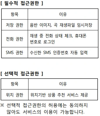음악 앱인 멜론을 예로 들면 필수적 접근 권한으로 전화, 저장 공간이 있고 선택적 접근 권한으로 연락처, 마이크, SMS가 있습니다.