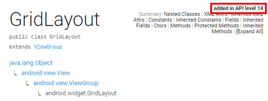 예를 들어, GridLayout은 API 레벨 14 이상에서만 이용할 수 있기 때문에 targetApi를 14로 지정해야 합니다.