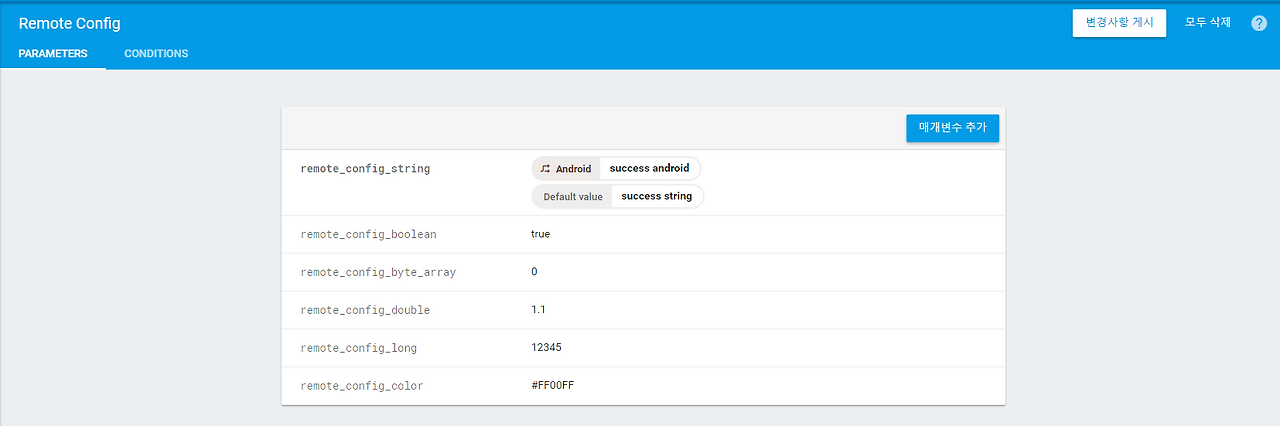 (Firebase 프로젝트에서 2000개의 매개변수와 최대 100개의 조건까지 가질 수 있습니다. 매개변수의 키는 256자까지 입력이 가능합니다. 매개변수 값은 500,000 자를 넘지 못합니다.)