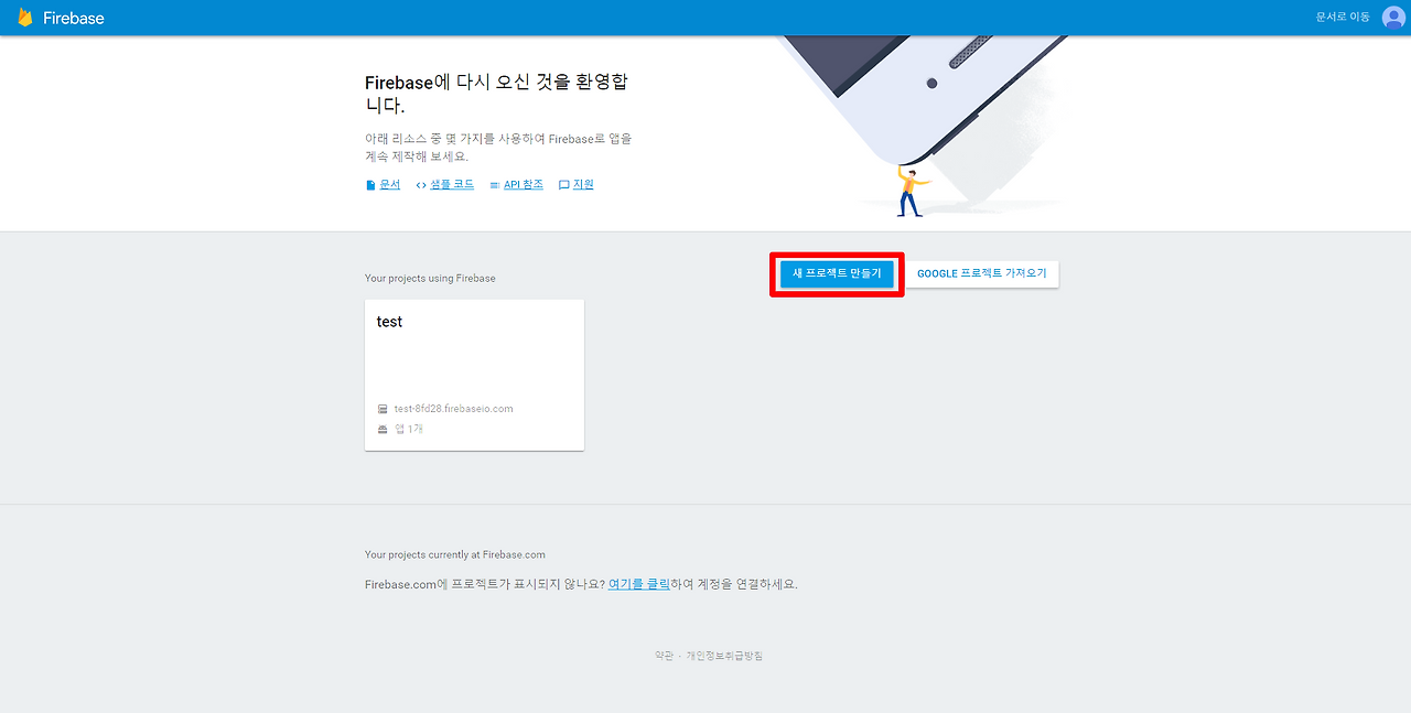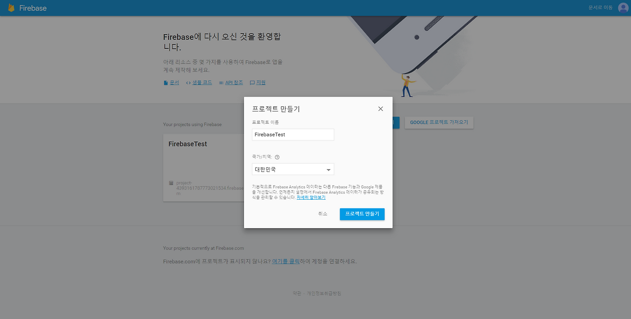 아래 firebase console 사이트에 가입 후, 프로젝트를 생성합니다.