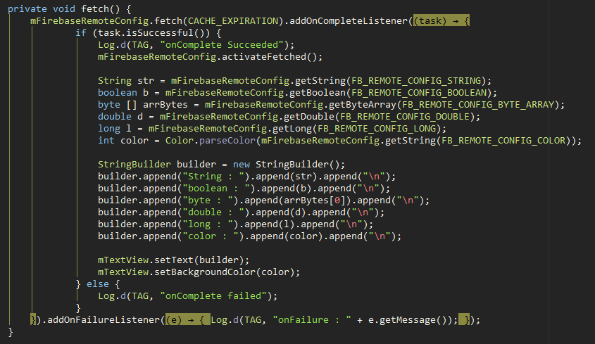 mFirebaseRemoteConfig.fetch(CACHE_EXPIRATION).addOnCompleteListener(new OnCompleteListener<Void>() {