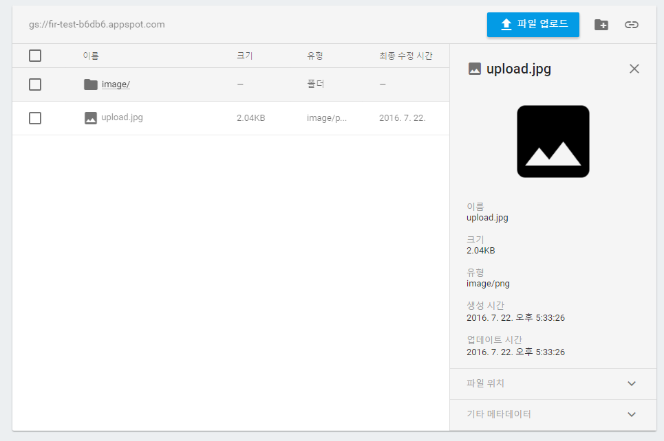 bucket안에 있는 이 파일들은 로컬 하드 디스크에 있는 파일 시스템이나 Firebase Realtime Database에 있는 데이터처럼 계층적 구조로 표시됩니다.