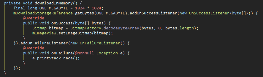 mDownloadStorageReference.getBytes(ONE_MEGABYTE).addOnSuccessListener(new OnSuccessListener<byte[]>() {