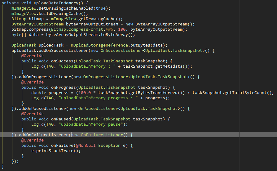 UploadTask uploadTask = mUploadStorageReference.putBytes(data);