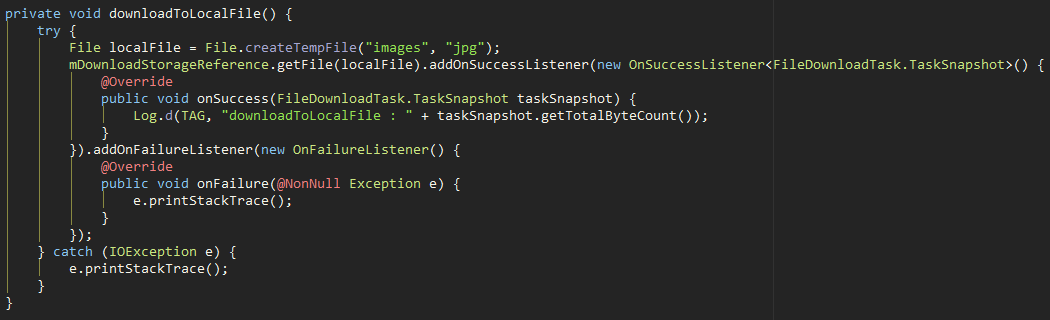 mDownloadStorageReference.getFile(localFile).addOnSuccessListener(new OnSuccessListener<FileDownloadTask.TaskSnapshot>() {