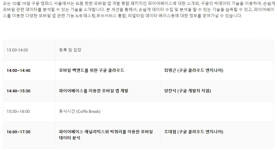 모바일앱에 활용 가능한 파이어베이스 의 기능과 각 기능에 대한 장단점, 앞으로의 개선 방향에 대한 솔직한 얘기들을 들을 수 있는 세션이였습니다.