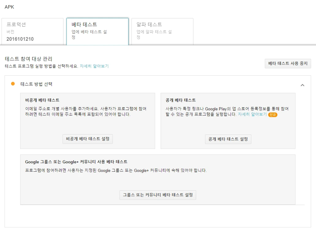 구글 플레이 개발자 콘솔에서는 베타 테스트와 알파 테스트를 지원하고 있습니다.