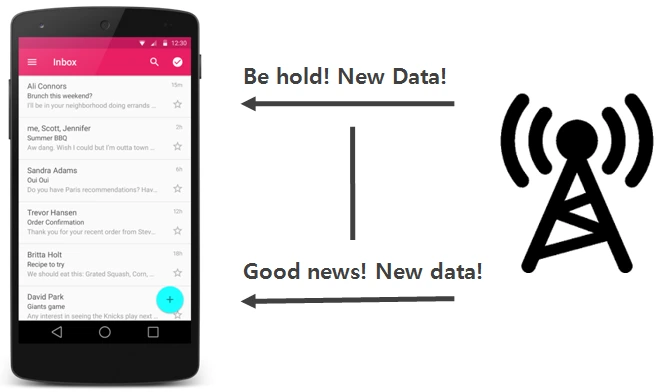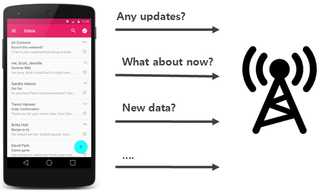 앞서 설명한 대로 일정한 간격으로 동기화를 하면 배터리나 네트워크 같은 리소스 낭비가 발생할 수 있습니다.