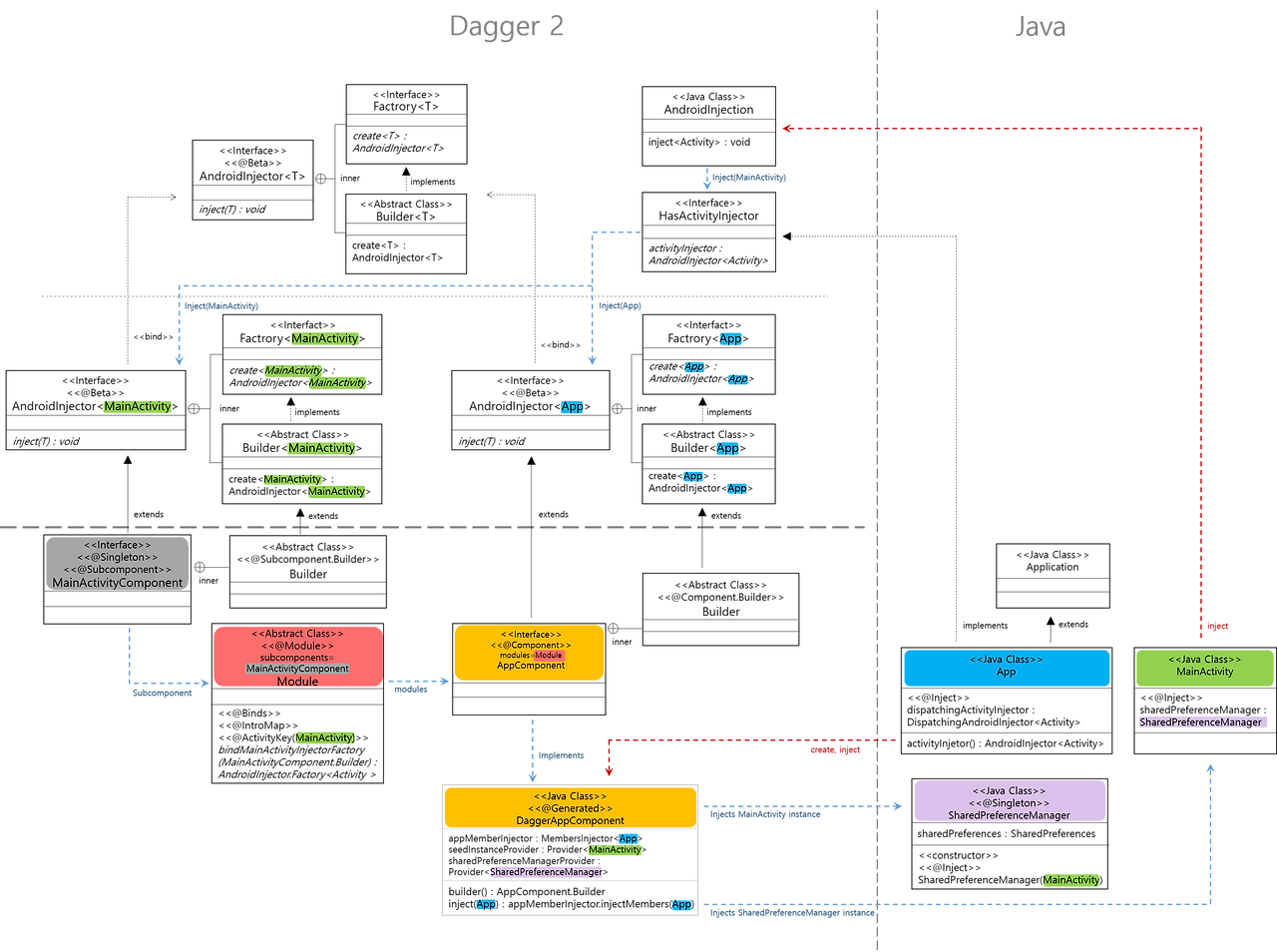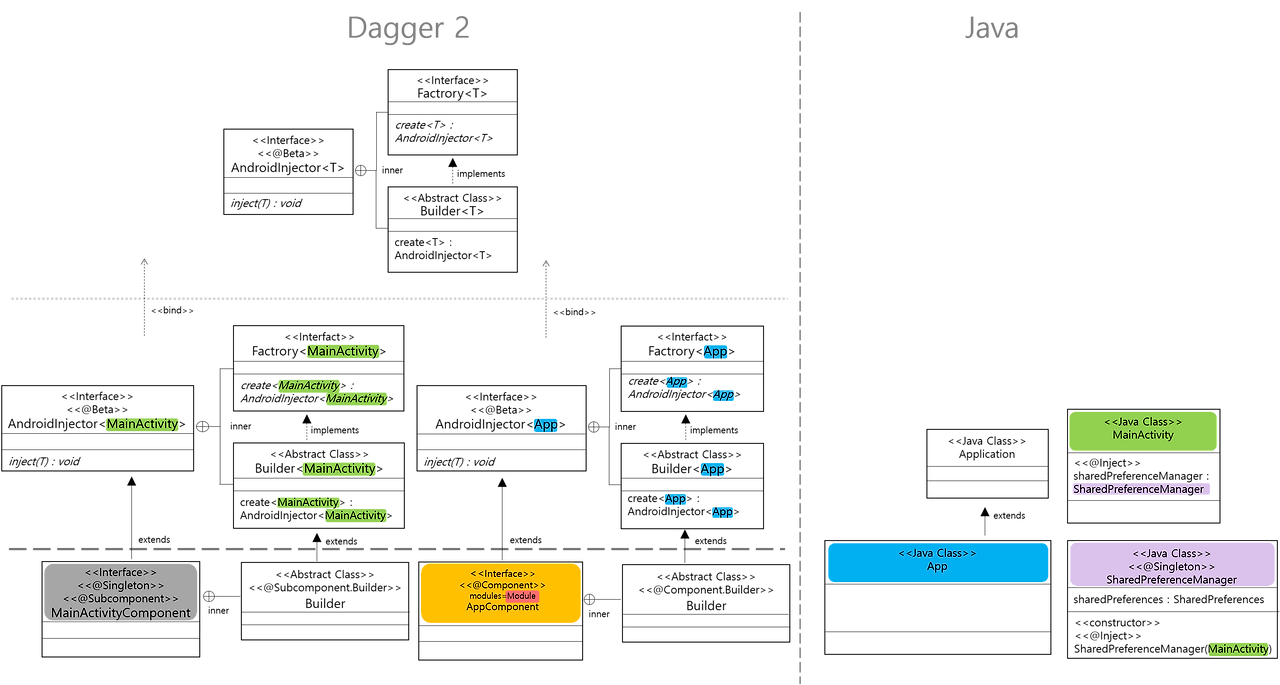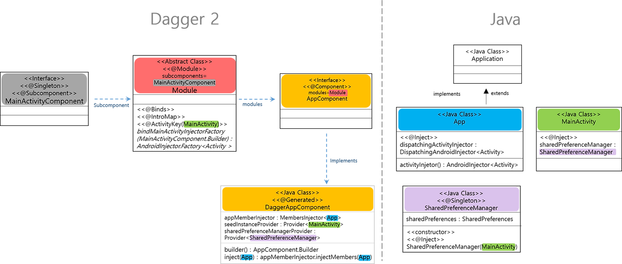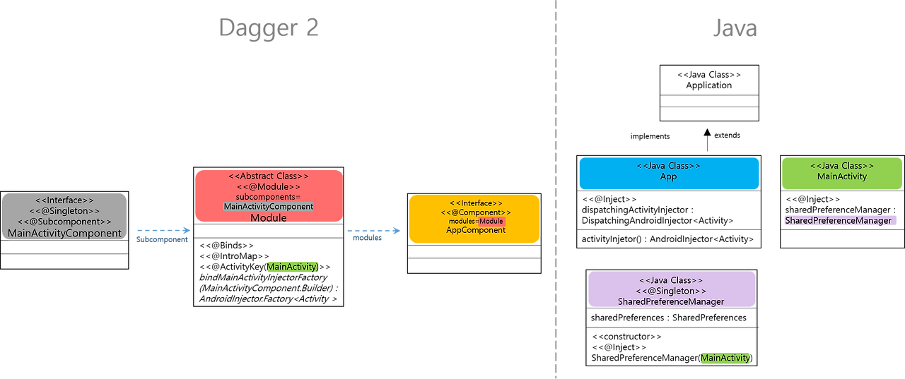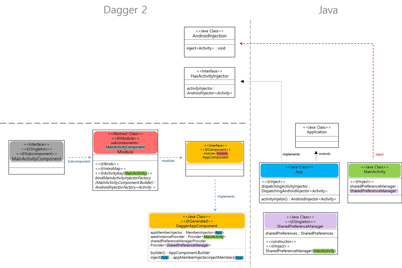 실제로 의존성(MainActivity, SharedPreferenceManager 인스턴스)를 주입하는 부분은 Dagger가 담당하게 됩니다.