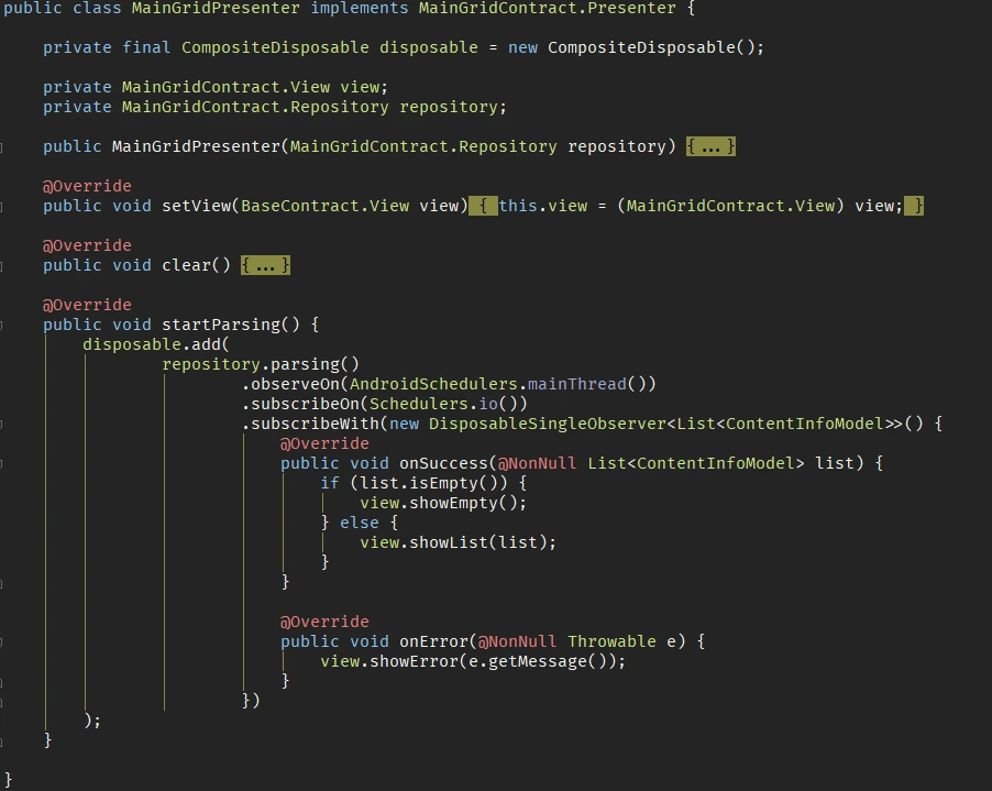 아래 코드는 Model(Repository)에서 RxJava의 Single 형태로 데이터를 파싱 하여 가져와 이를 기반으로 view를 업데이트하는 Presenter입니다.