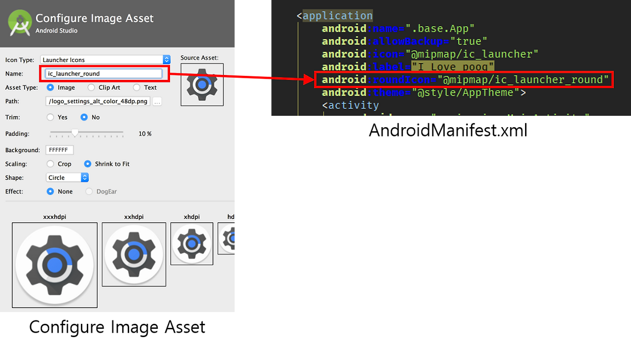 직접 Round Icon을 만들거나, Image Asset Studio를 통해 쉽게 만들어서 AndroidManifest.xml에 지정만 해주면 됩니다. 그러면 기기에 따라 Round Icon이나 그냥 Icon 둘 중에 하나를 선택하여 표시하게 됩니다.