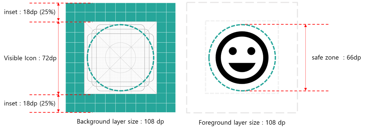 하지만 일부 기기에서는 중앙 66dp 영역에 마스크를 적용할 수 도 있기 때문에 안전하게 Adaptive icons을 적용하기 위해서는 실제 표시되는 Foreground의 이미지 영역을 66dp로 잡는 게 좋습니다.