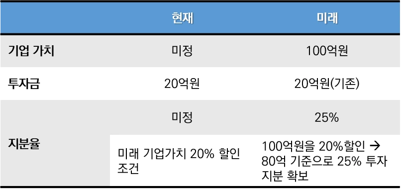 초기 기업은 측정 지표가 없어서 Valuation이 어렵기 때문에 기업가치를 정하지 않고 일단 투자한 후, 나중에 후속 투자를 할 때 기업가치가 결정되면 그에 따라 선 투자자의 지분율이 결정되는 방식인 것이다. 이렇게 하면 초기 가치산정의 혼란 방지, 신속한 투자 집행, 과도한 지분 희석 방지, 고평가(고밸류) 위험 회피 등을 할 수 있다.