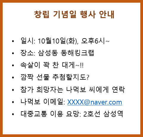 슬라이드를 만들 때에 핵심 사항을 잘 전달하기 위해서 항목별로 정리하는 경우가 많다. 그런데 욕심껏 내용을 담다 보면 항목이 지나치게 늘어나 오히려 이해하기 힘들어진다. 심리학 교과서를 보면 '사람은 한 번에 7개까지 인식할 수 있다'는 주장이 나온다. 7개까지는 그럭저럭 기억해내지만 8개가 넘으면 한 번에 기억하기가 어렵다는 것이다.