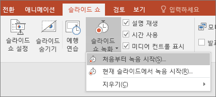 파워포인트의 <슬라이드쇼 메뉴>에서 <슬라이드쇼 녹화> 버튼을 누른 후 다시 <녹음/녹화> 버튼을 누른 후, 슬라이드를 보면서 내용을 설명하고 녹화 종료 버튼을 누르면, 페이지별로 교수자의 목소리가 포함된 PPT 자료가 된다. 이후는 그 자료를 영상으로 저장(다른 이름으로 저장, 또는 내보내기)하면 된다.