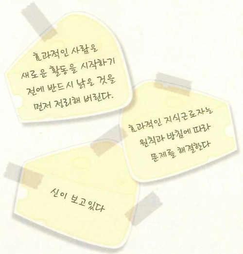 홍대리는 영업 업무를 시작한 후에 어떤 마음으로 일을 해왔는지 생각했다. 신입사원이라는 마음으로 업무에 임했고, 뒤늦게 시작한 일인 만큼 남들보다 몇 배 더 열심히 해야겠다고 각오를 다지며 최선을 다한 시간이었다. 비록 신이 보고 있다는 생각으로 일하지는 않았지만, 만일 그렇게 생각했다고 해도 지금보다 더 열심히 일하진 못했을 것이란 생각이 들었다. 하지만 ‘이 정도면 됐어. 누구도 이렇게 까지는 못했을 거야.’라는 생각은 버리고, ‘신이 보고 있다’는 생각으로 업무에 임하기로 다짐했다. 홍대리는 ‘신이 보고 있다는 마음으로 일한다.’를 업무 원칙에 포함시키고, 치즈 포스터를 만들어 책상 주변에 붙여 놓았다.