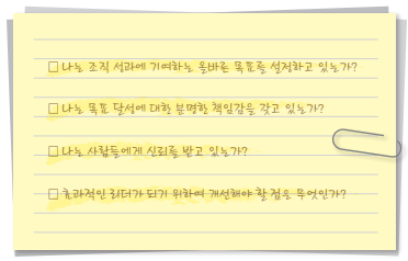 “리더십의 두 번째 본질은 책임이야. 효과적인 리더들은 리더십을 계급과 특권으로 보는 것이 아니라, 책임으로 보고 있어. 사실 많은 리더는 책임을 묻는 위치에 있다고 생각하지. 하지만 상사가 그러한 태도를 보이면 부하 직원들은 헌신적 노력을 하지 않지. 리더는 부하 직원들과 함께 달성해야 할 목표에 대한 책임을 분명히 할 때 사람들의 에너지를 끌어낼 수 있어.”