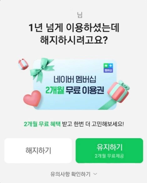나는 네이버 멤버십을 한 달 무료 이용권부터 이용하기 시작해서 그때 당시에 1년 이용권을 끊었기 때문에 아직 해지에 대한 경험을 하지 않은 상태이다. 그런데 네이버 플러스 멤버십을 검색하면서 자료를 찾으러 돌아다니다가 '해지 방어'라는 신기한 키워드를 발견하게 된다. 여기서 해지 방어는 말 그대로 사용자가 해지하려는 것을 방어하기 위해서 소비자들이 해지하기 직전에 기업들이 추가 혜택을 제공하거나 다른 제품을 추천함으로써 해지하지 못하게 하는 것이다. 네이버 플러스 멤버십에서는 해지 방어 전략을 사용하여 해지를 하려고 할 때 2개월을 추가로 무료 제공하고 있었다. 네이버에서 여러 후기들을 찾아보니 해지를 하려고 했다가, 2개월 무료 제공으로 인해 계속 이용하고 있다는 후기를 여럿 찾아볼 수 있었다.